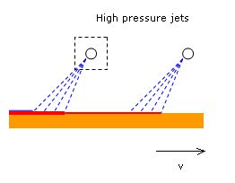 As part of the modeling I use Abaqus to study the mechanical integrity (this is a thermomechanical analysis) of oxide scale. The most difficult part in the analysis is the hydraulic descaling (see figure). During descaling process, certain amount of the oxide layer is subjected to a tremendous thermal shock as well as the impact force that will cause the eventual failure and removal of the oxide crust. I have no idea of how to model the cracking and spalling of the oxide crust with Abaqus, I am not familiarized with fracture mechanics, so I tried to used some cohesive elements so that when they reach a critical strees value they could debond at the interface oxide-steel but this elements are no supported for a thermomechanical analysis. Other procedure I was thinking was in some way to "delete" oxide elements after descaling (without modeling crack behavior) and then evaluate the stress distribution and see if the critical stress is reached but this procedure seems unrealistic.