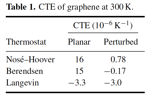 Our recent MD simulation study indicated that initial out-of-plane displacement of carbon atoms is necessary to simulate the physical behaviour of a graphene when the Nos´e–Hoover or Berendsen thermostat is used. According to our results, Langevin (Lan) thermostat is better than Nos´e–Hoover (NH) and Berendsen (Ber) thermostats. NH and Ber induce non-physical coefficient of thermal expansion of graphene as indicated in the figure and table below. The cofficient of thermal expansion (CTE) given by Langevin thermostat is quite close to the experimental values. For more detail, please see M A N Dewapriya et al (2013) Modelling Simul. Mater. Sci. Eng. 21 065017