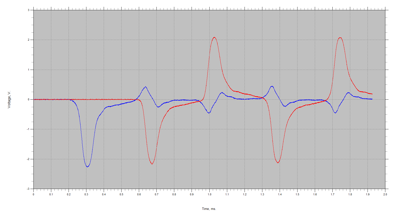 I have included our most recent data. The first blue pulse is the incident pulse, the second blue pulse is the relfected and the first red pulse si the transmitted pulse. Voltage from the strain gages is read by a Vishay analog strain amplifier and then fed into a picoscope.