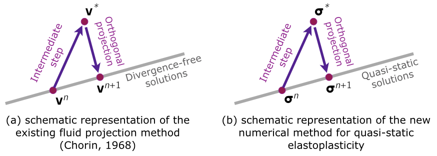 In the paper attached below (by Chris Rycroft, Yi Sui and Eran Bouchbinder) we address this problem by building a mathematical correspondence between Newtonian fluids in the incompressible limit and hypoelastic-plastic solids in the quasi-static limit. In the incompressible fluids problem, it is the pressure field (rather than the velocity field) that cannot be updated explicitly in time. A well-established numerical approach to solve this problem is Chorin's projection method, whereby the fluid velocity is explicitly updated, and then an elliptic problem for the pressure is solved, which is used to orthogonally project the velocity field to maintain the incompressibility constraint.