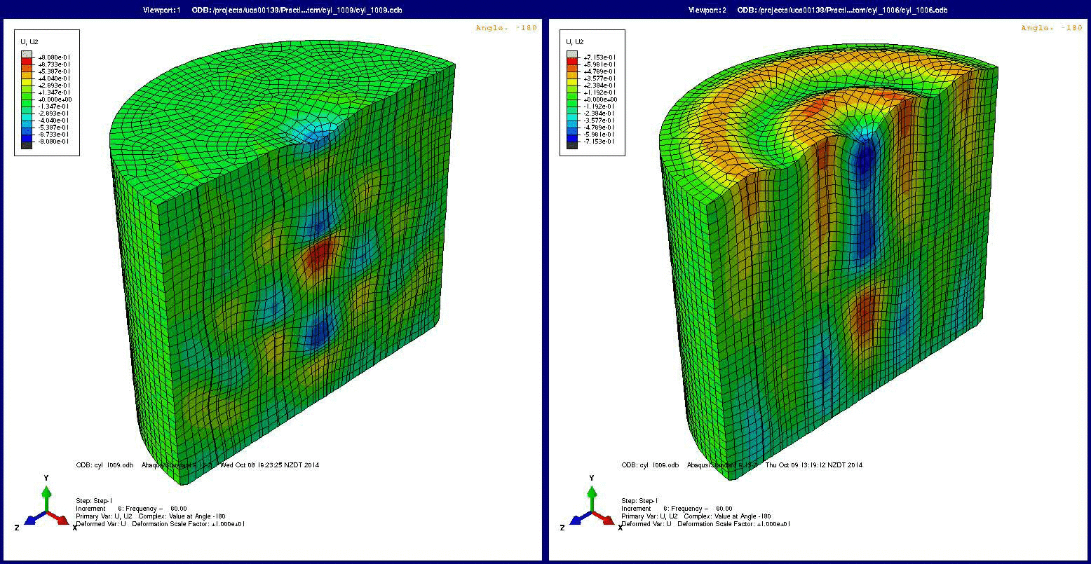 I am using a steady-state dynamic analysis procedure to model harmonic loading of a structure. I am investigating different material definitions. When I applied transversely isotropic stiffness using engineering constants, I saw a much different response than expected. So, as a test, I compared the following two models which gave DIFFERENT results: