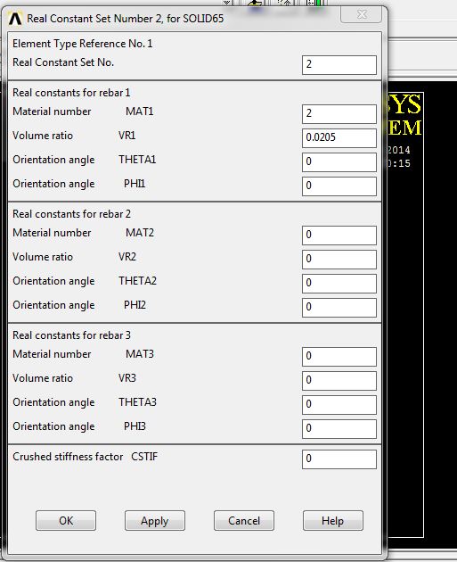 1. I have first created all required nodes. Solid65 is taken as element. Four set of real constant of solid65 are made, first one with material1 and all other parameter zero, second set with Volumetric ratio(VR) for main bar and other two set for skin +hanger and shear stirrups . An element of solid65 is created by selected 8 nodes with first set of real constant.By coping this element ,all other elements are generated. By going to modeling -create-modify-element attributes, required element attributes are changed. By this , smeared reinforcement is provided in desired location. Is this approach correct?????????