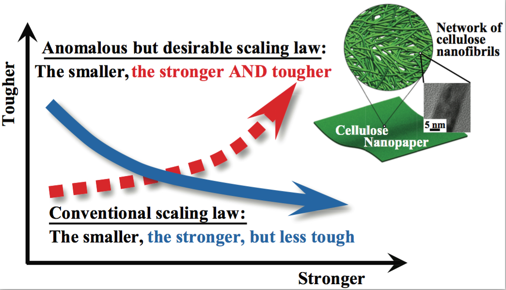 A long-standing challenge in material design is to overcome the conflict between strength and toughness, because they are generally mutually exclusive. To address this challenge, we rationally design cellulose-based nanopaper and investigate the dependence of their mechanical properties on constituent cellulose fiber size. Surprisingly, we find that both the strength and toughness of the nanopaper increase simultaneously (40 and 130 times, respectively) as the average diameter of constituent cellulose fibers decreases from 27 μm to 11 nm, suggesting the promising potential toward an anomalous but highly desirable scaling law: the smaller, the stronger and the tougher. There are abundant opportunities to use the fundamental bottom-up strategy to design a novel class of functional materials that are both strong and tough.