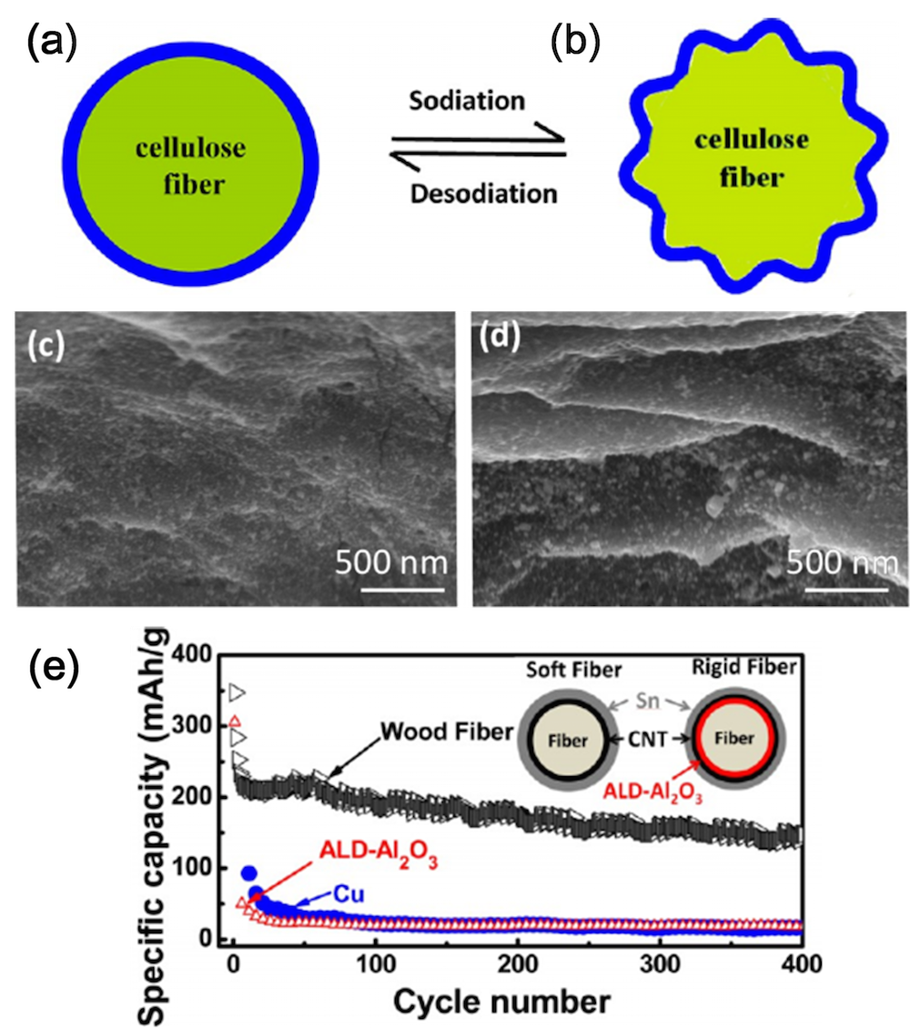SEM observation confirms our hypothesis. Figure 10c shows that the electrodeposited Sn initially forms a continuous film on the conductive wood fiber. The formation of a wrinkled structure on all wood fibers is observed in Figure 10d. The wrinkling is associated with fiber deformation, resulting in the improved cycling performance. Figure 10e plots the specific capacity versus cycle number for Sn on three different substrates at a rate of C/10; natural wood fiber, Cu, and ALD Al2O3-coated wood fiber. The Sn-coated wood fiber remains an initial discharge capacity of 145mAh/g after 400 cycles; among the best cycling performance for Sn anodes in Na-ion batteries.