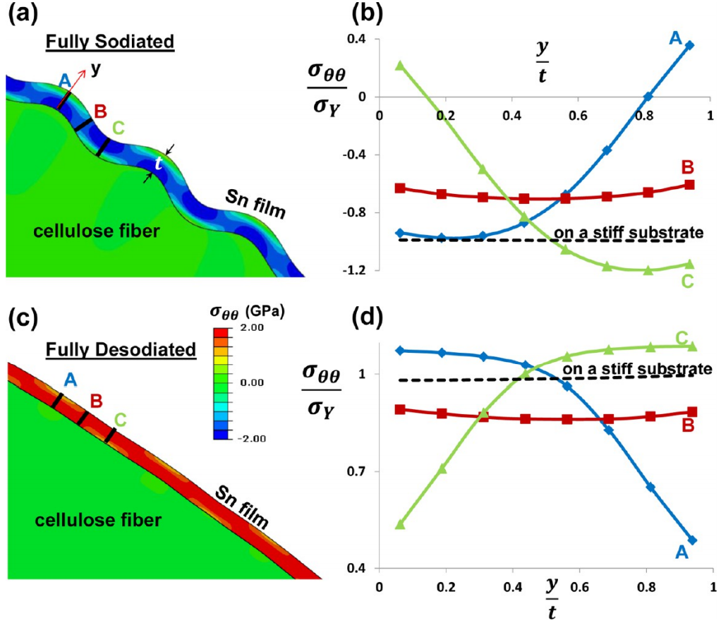 Figure 11a plots the Sn film morphology on the wood fiber and the contour of hoop stress σθθ (normal stress in the circumferential direction) in the Sn film at the fully sodiated and half sodiated states, respectively. Figure 11b plots the hoop stress distribution through the fully sodiated Sn film thickness at three representative locations: the crest (A), midpoint (B), and trough (C) of the wrinkle. For comparison, the hoop stress distribution in a fully sodiated Sn film supported by a stiff substrate is plotted in Figure 11b. The majority of sodiation-induced hoop stresses in the wrinkled Sn on wood fiber are significantly less than those in the smooth Sn film on a stiff substrate. Modeling results further reveal that wrinkling of the Sn film on a soft cellulose fiber during sodiation half-cycle not only mitigates the sodiation-induced compressive stress but also plays a crucial role in reducing the tensile stress level in the Sn film during the desodiation half-cycle. It is this tensile stress that is the key driving force for Sn anode fracture during cycling. During discharging, Na ions are removed from the Sn film, smoothing out the wrinkling deformation. The Sn film recovers the rather smooth initial morphology after complete desodiation. Desodiation causes contraction of the Sn film; contraction that is constrained by the substrate. As a result, tensile hoop stresses accumulate in the Sn film during discharging. A high hoop stress could initiate and drive crack propagation through the Sn film, leading to the mechanical failure of the anode and capacity loss. In discharging the wrinkled Sn film from the fully sodiated state, smoothing of the wrinkled morphology partially accommodates the film contraction. Consequently, the resulting tensile stress after discharging is reduced. Stiff substrates (Al2O3 or Cu) also constrain the discharging-induced contraction in the Sn film. As shown in Figure 10c,d, the majority of tensile stresses of the Sn film supported by the wood fiber at full desodiation are effectively reduced. In comparison, high tensile stresses are apparent throughout the Sn film supported by a stiff substrate. In some locations on the Sn film supported by the wood fiber (e.g., near the interface at A or near surface at C), the tensile stress is moderately higher than for the stiff substrate-supported Sn film. The stresses are localized to an area half the thickness of the entire Sn film; the stresses in the other half of the film, however, are much less. This behavior is crucial to prevent crack propagation through the film. Cracks initiating from regions of high tensile stresses will not propagate through the entire Sn film due to an insufficient driving force in the low stress region. The overall structural integrity of the Sn film is preserved, ideal for high cycle performance. By contrast, the high tensile stresses in the Sn film supported by a stiff substrate are uniform through the entire film. Once cracks initiate, they will propagate through the film, pulverizing the Sn anode and reducing the active capacity and cycle performance.