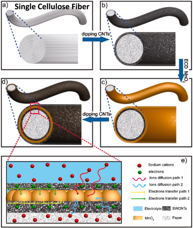 Figure 12. Schematic illustration for synthesis process of an electrode of paper/CNTs/MnO2/CNTs. (a-d)Multiple coatings are performed on the cellulose fiber. (e) Magnification of the square area highlighted in (d) to illustrate the dual electron charge transfer and ion diffusion paths in the paper/CNTs/MnO2/CNTs (P-CMC) configuration.