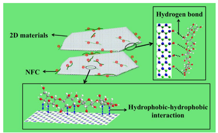 In this study (16), TEMPO-oxidized NFC is used as a dispersant to disperse 2D materials (BN and MoS2) in water. Figure 13 illustrates the mechanism for the dispersion of 2D materials by NFC: NFC attaches to the flakes through the interaction between its hydrophobic sites and the flake's hydrophobic plane as well as hydrogen bonding between the NFC hydroxyl groups and the defective edges of the 2D materials. The flakes are stabilized due to steric hindrance and the electrostatic repulsive forces generated by the charged NFC carboxyl groups. This method is more suitable for green, large-scale dispersion of 2D materials since proper disposal of the solvent is not an issue any more.