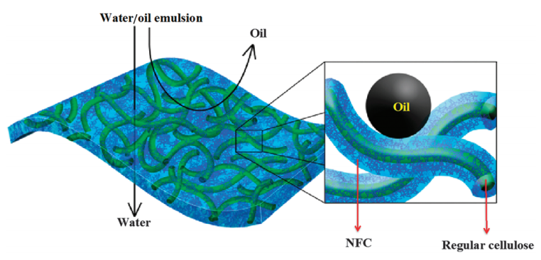 As shown in Fig. 14, coating the filter with a layer of NFC hydrogel, through a dipping and drying process, takes advantage of hydrogel’s hydrophilic behavior. This behavior causes the filter to absorb water until reaching saturation when it creates a hydration layer. The triple interface layers of hydrogel, water, and oil enhance the oleophobic behavior. The roughness of the hydrogel traps water in the microscopic crevices. The big difference in surface energy between oil and water keeps oil from penetrating the filter. Without the coating, both oil and water are capable of penetrating through the filter. Hydrating this coating generates oleophobic behaviour, while retaining hydrophilicity without using traditional functionalization groups. The hydrophilic/oleophobic behavior is uniquely created by taking advantage of the different properties and structures of cellulose at both the macroscopic and nanoscopic scale without introducing any harmful chemicals (17).