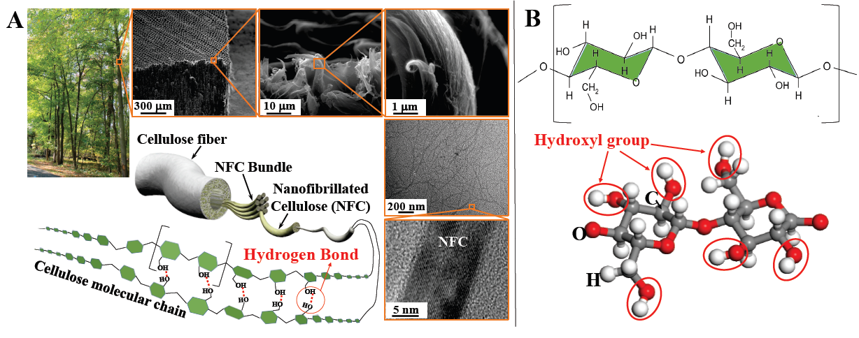 Figure 1. (A) Hierarchical structure of wood fibers and the characteristic of cellulose fibrils. Note the rich inter-chain hydrogen bonds among neighboring cellulose molecular chains. (B) Atomic structure of a cellulose chain repeat unit. Note the six hydroxyl groups (red circles) in each repeat unit.