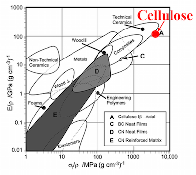 Fig. 2. Ashby plot of specific modulus vs. specific strength. Cellulose is superior over many engineering materials.