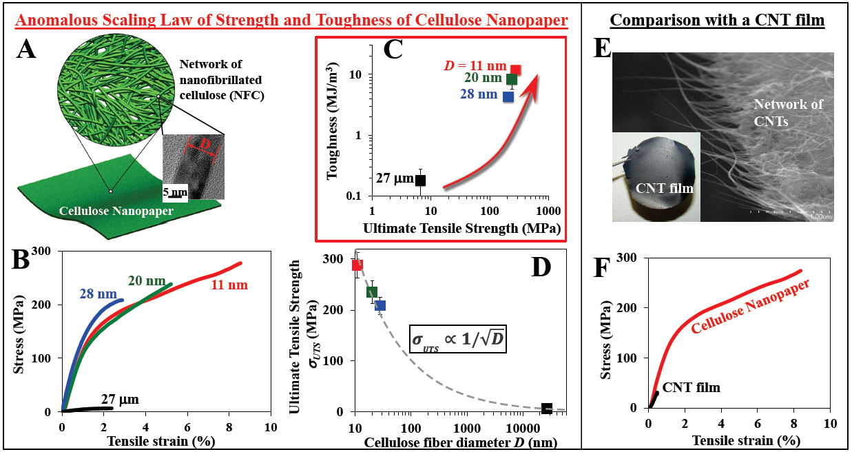 Figure 3A shows the schematic of cellulose nanopaper, made of a random network of NFC fibers. Inset shows the high resolution transmission electron microscope image of a ~11 nm NFC fiber. Figure 3B shows the stress-strain curves of tensile tests of cellulose paper made of cellulose fibers of various mean diameters. As the cellulose fiber diameter decreases from μm scale to nm scale, both tensile strength and ductility of the cellulose paper increases significantly, leading to an anomalous scaling law shown in Figure 3C: The smaller, the stronger AND the tougher. Figure 3D further reveals that the ultimate tensile strength scales inversely with the square root of cellulose fiber diameter (11). Figure 3E shows optical (inset) and scanning electron microscope image of a CNT film made of network of CNT bundles. Figure 3F shows that, lack of inter-CNT hydrogen bonds, the CNT film has a much lower tensile strength and toughness than the cellulose nanopaper, although the constituent CNT bundles and NFC fibers have comparable diameter (11nm).