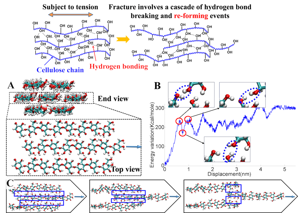 A 20~50 µm thick native wood fiber comprises thousands of nanofibrillated cellulose (NFC) fibers (5-50 nm in diameter), each of which can be disintegrated into finer elementary fibrils consisting of cellulose molecular chains (1-10). Cellulose molecule is a linear chain of ringed glucose molecules, with a repeat unit (Fig. 1B) comprising two anhydroglucose rings (C6H10O5) linked through C-O-C covalent bond. Rich hydroxyl groups in cellulose molecule (six in each repeat unit) enable facile formation of hydrogen bonds, both intra-chain and inter-chain (Fig. 1A). While the intra-chain hydrogen bonding stabilizes the linkage and results in the linear configuration of the cellulose chain, inter-chain hydrogen bonding among neighboring cellulose molecules plays a pivotal role in the deformation and failure behaviors of cellulose-based materials. Cellulose has appealing mechanical properties, with specific modulus (~100 GPa/(g/cm3)) and specific strength (~4 GPa/(g/cm3)) higher than most metals and composites, and many ceramics, making it as a promising building block for functional and structural materials (Fig. 2).