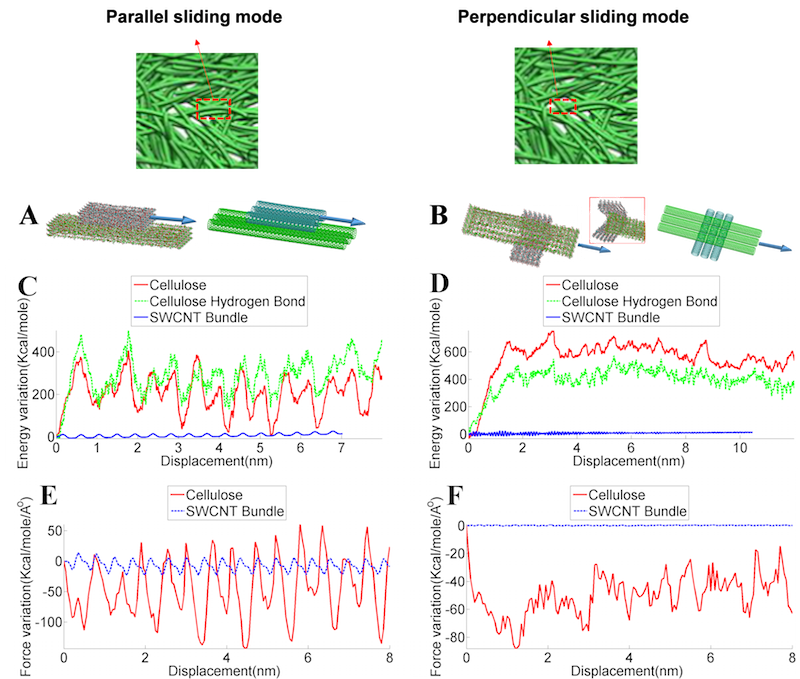 Figure 5A shows the simulation models of the two surface areas in direct contact for parallel sliding between two NFC fibers (top panel) and that between two CNT bundles (bottom panel). Figure 5C shows the variation of total potential energy as a function of relative displacement of parallel sliding between two NFC fibers (green) and that between two CNT bundles (blue). The contribution from hydrogen bonds between NFC fibers (red) is included for comparison. Figure 5E shows the evolution of resistant force during parallel sliding of two neighboring NFC fibers (red) and two neighboring CNT bundles (blue). Figure 5B, 5D and 5F show the results for the case of perpendicular sliding, in correspondence to A., C. and E., respectively. The variation of total hydrogen bonding energy, which matches well with that of the total potential energy in terms of both peak location and amplitude, offering strong evidence for the cascade of events of hydrogen bond breaking and re-forming during the sliding process and the dominant role of hydrogen bonding in the toughening mechanism of cellulose nanopaper. The magnitude of resistant force in NFC fiber case is substantially higher than that in the CNT case, shedding light on molecular scale understanding of the huge difference in tensile strength between cellulose nanopaper and CNT films.