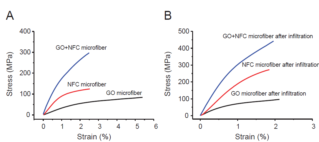 Figure 7A exhibits the typical stress-strain curves for tensile tests of GO microfibers, NFC microfibers, and GO-NFC hybrid microfibers. To improve the mechanical properties of our GO-NFC hybrid microfibers, we utilize metal ions (Ca2+) to introduce ionic bonding between the GO and the NFC by taking advantage of the oxygen and carboxylate groups from these two building blocks. We infiltrate the hybrid microfibers in a CaCl2 water solution in order to further improve the strength of the fibers. Figure 7B depicts the typical stress-strain curves for tensile tests of GO microfibers, NFC microfibers, and GO-NFC hybrid microfibers after metal ion infiltration. The synergistic effect of improving the mechanical properties of fibers is clearly demonstrated.