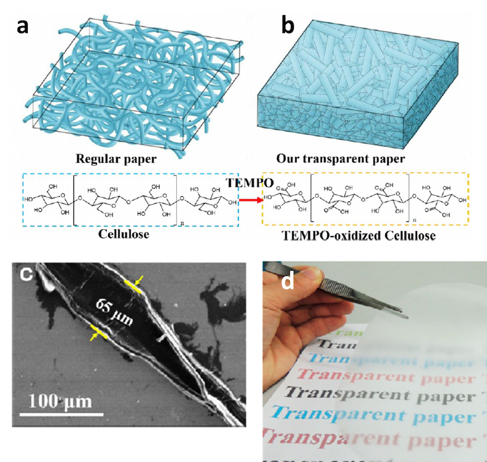 Figure 8. (a) Top left, regular paper; bottom left, molecular structure of cellulose. (b) Top right, transparent paper made of TEMPO-oxidized wood fibers; bottom right, TEMPO-oxidized cellulose with carboxyl groups in the C6 position. SEM images of unzipped TEMPO-oxidized wood fibers (c). (d) A digital image of transparent paper produced from TEMPO-oxidized wood fibers.