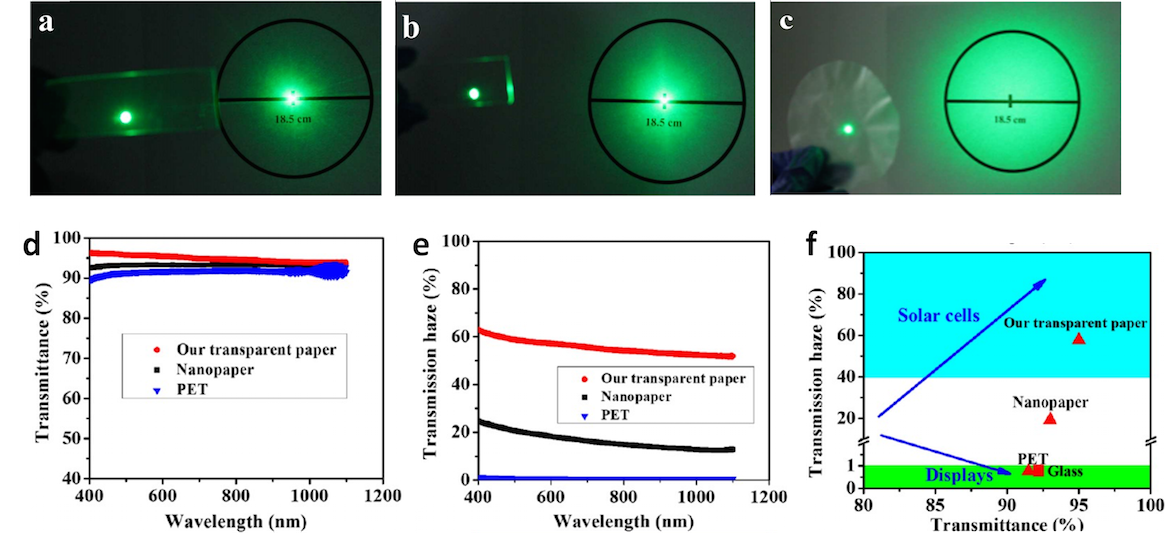 Solar cell substrates not only require high optical transparency but also prefer high optical haze to increase the light scattering and consequently the absorption in the active materials. Unfortunately, there is always a trade-off between these two optical properties, which is exemplified by common transparent paper substrates exhibiting a transparency of about 90% yet a low optical haze (<20%). In this work, we introduce a novel transparent paper made of wood fibers that displays both ultrahigh optical transparency (∼96%) and ultrahigh haze (∼60%), thus delivering an optimal substrate design for solar cell devices (9). Compared with previously demonstrated nanopaper composed of wood-based cellulose nanofibers, our transparent paper has better dual performance in transmittance and haze but also is fabricated at a much lower cost. This high-performance, low-cost transparent paper is a potentially revolutionary material that may influence a new generation of environmentally friendly printed electronics.