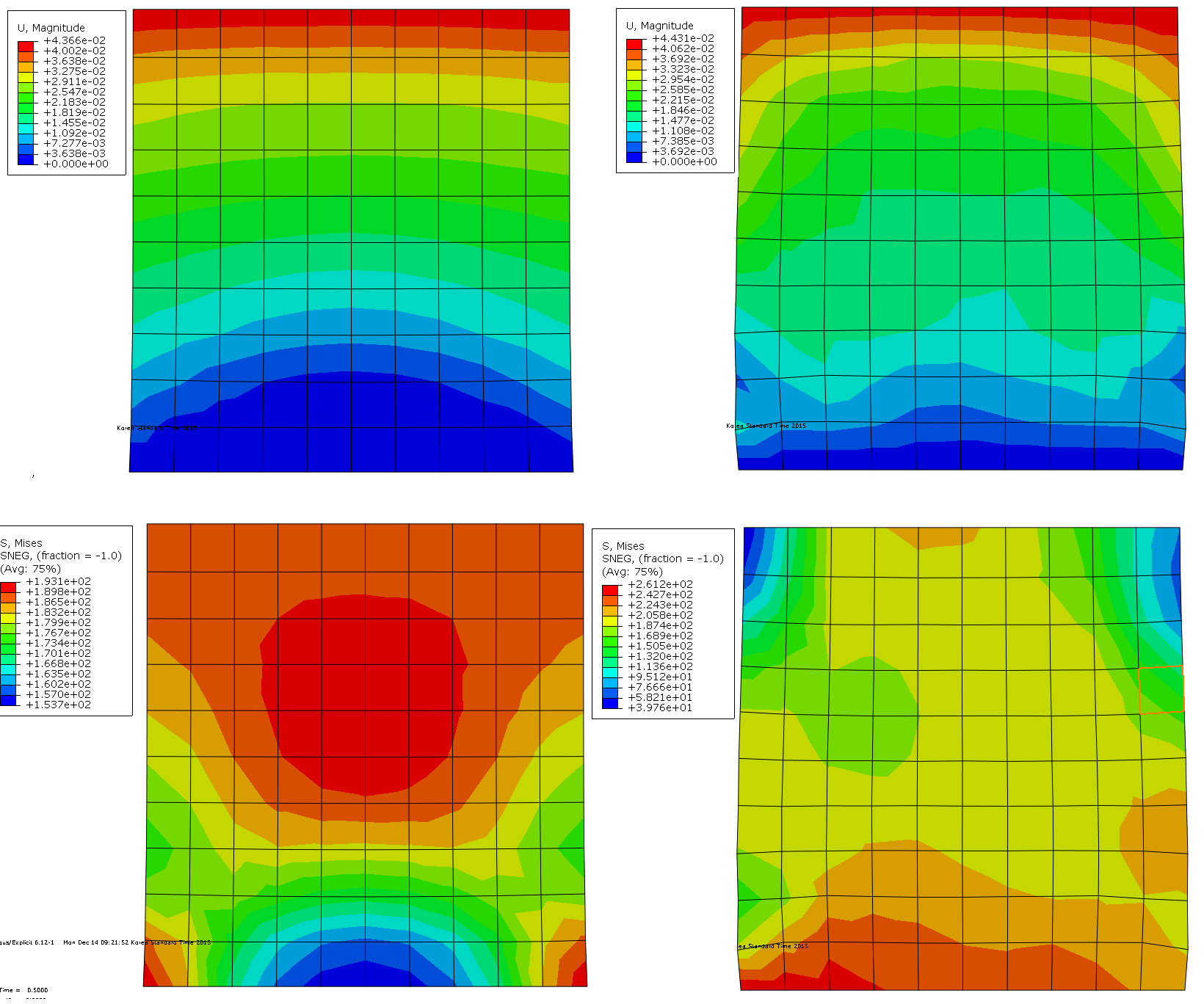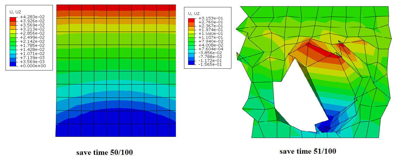 When I meshed the square by 1x1 until 5x5 element (S4R), the simulation can finish with similar results. But my problem is when I increase the number of element to mesh the square ( in my case is 7x7 or 10x10), simulation can not finish. I stopped after tensile about 5% (at save time of 50 over 100 that I set before) as show in Fig. 2. In the next save time, the results are crazy.