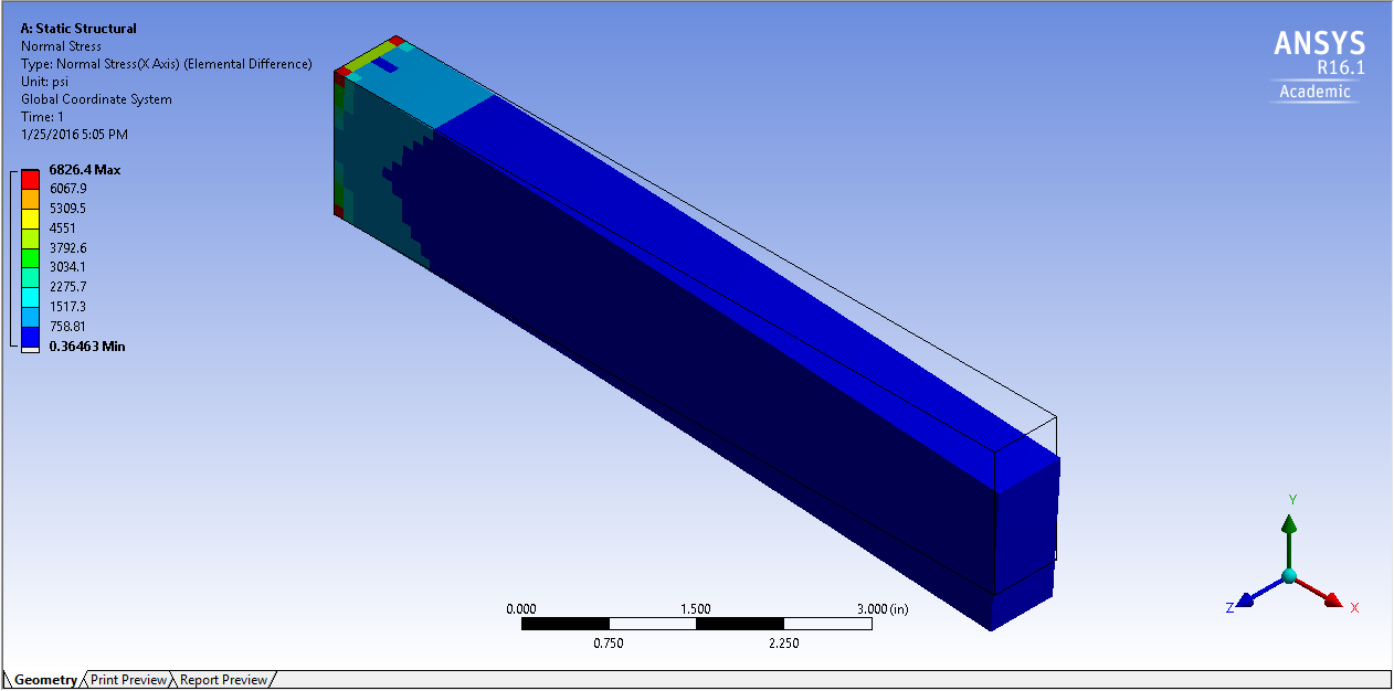 I have a cantilever beam, 8 in long, rectangular cross section W=0.75 in, H=1.5 in, E=29 msi, Poisson's=0.3, under uniform line load qy = -50 lbf/in (y direction) entire length, bending around strong axis (zz). Beam theory solution M*c/I gives max. stress = 5687 psi.