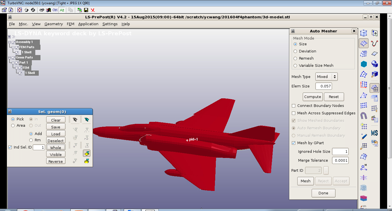 I downloaded a geometry on line and tried to make mesh by using "Auto Mesher" on LS-PREPOST. After I selected all parts from the left hand side on LS-PREPOST window, those geometry parts didn't show up on "sel. geometry(0)". The option "Mesh" in "Auto mesher" didn't work at all. Please see the settings in the attachment. Could anyone please give me some suggestions to fix this problem? Any idea would be apprecited. Thank you.