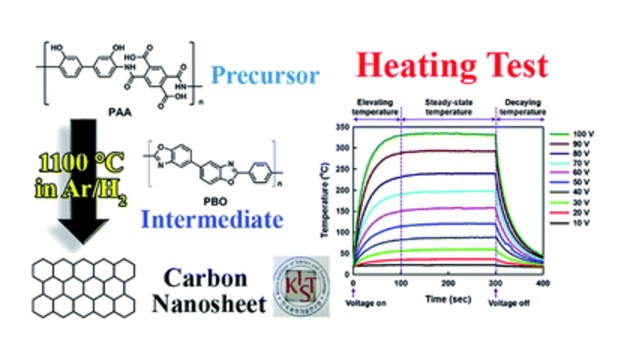 In this work, a novel film heater in nanometer-scale thickness based on catalyst-free and transfer-free carbon nanosheets (CNSs) with properties similar to graphene is fabricated. Here, poly(amic acid) (PAA), which is composed of several aromatic hydrocarbon rings, is used as the carbon precursor of CNS films. Altering the polymer concentration easily controls the morphological, optical, and electrical properties of the CNS films obtained by carbonization of PAA thin films. The CNS films with different thicknesses of 7.53–28.40 nm are simply prepared through spin-coating on a quartz substrate and post heat-treatment. Finally, their direct use as transparent film heaters is deeply investigated by considering electrical conductivity, temperature response rapidity, achievable maximum temperature, and electric power efficiency. For instance, an electrically conductive and optically transparent CNS film with 28.40 nm thickness exhibits excellent electric heating performance achieving well-defined steady-state maximum temperatures of 24–333 °C at low input electric power per unit film area of 0.027–1.005 W cm−2 in a relatively short time of ∼100 s.
