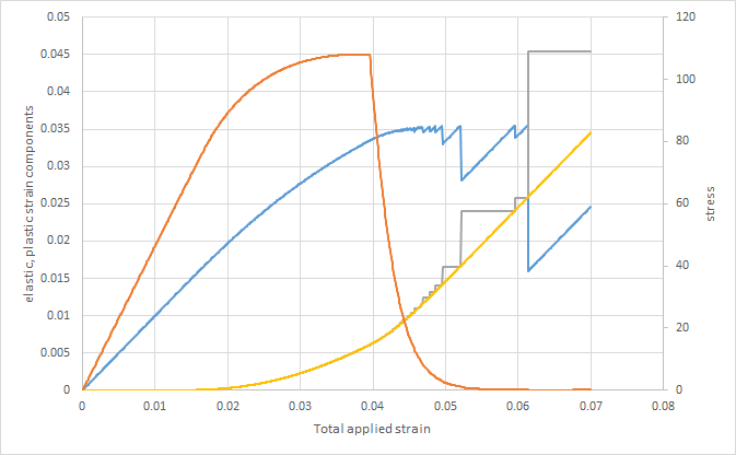 (b) Some times, I can observed that the plastic strain increment is higher than total strain increment (this can be observed for an applied strain value > 0.06). This is absurd.
