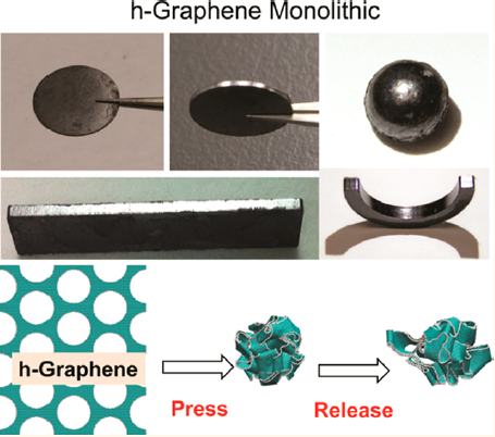 Abstract: By creating holes in 2D nanosheets, tortuosity and porosity can be greatly tunable, which enables a fast manufacturing process (i.e., fast removal of gas and solvent) toward various nanostructures. We demonstrated outstanding compressibility of holey graphene nanosheets, which is impossible for pristine graphene. Holey graphene powder can be easily compressed into dense and strong monoliths with different shapes at room temperature without using any solvents or binders. The remarkable compressibility of holey graphene, which is in sharp contrast with pristine graphene, not only enables the fabrication of robust, dense graphene products that exhibit high density (1.4 g/cm3), excellent specific mechanical strength [18 MPa/(g/cm3)], and good electrical (130 S/cm) and thermal (20 W/mK) conductivities, but also provides a binder-free dry process that overcomes the disadvantages of wet processes required for fabrication of three-dimensional graphene products. Fundamentally different from graphite, the holey graphene products are both dense and porous, which can enable possible broader applications such as energy storage and gas separation membranes.