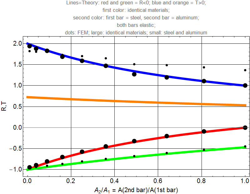 the FEM data for identical materials (large dots on the red and blue curves) and the ones for the reflection coefficient in case of different materials (small dots on the green curve) match the theoretical result.