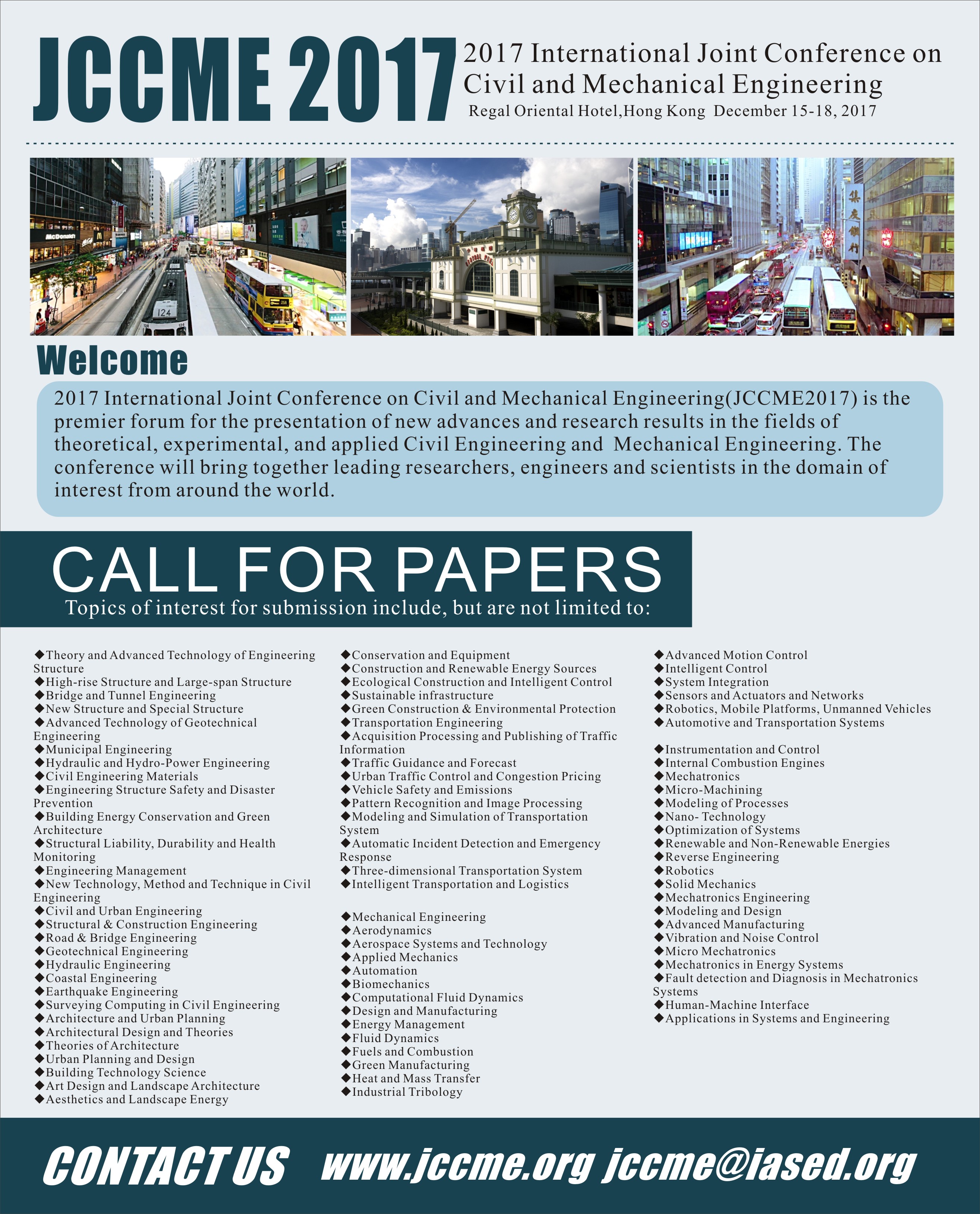 On December 15-18, 2017 International Joint Conference on Civil and Mechanical Engineering (JCCME 2017 http://www.jccme.org/ ) will be held in Hong Kong. The conference is organized by IASED (International Academy of Science and Engineering for Development, www.iased.org) and technical supported by many university and institute.. All over the world are to take part in this conference.