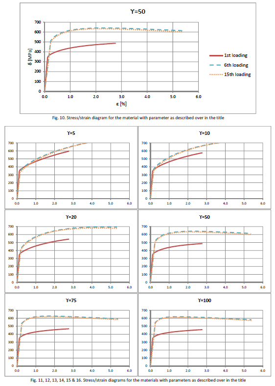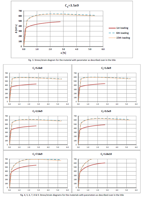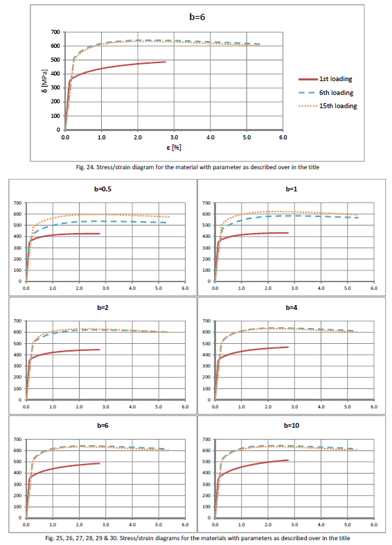 Similar thing with the diagram 5. b should only change the 'rate at which f_y change with plastic strain', so also no influence on the curve itself and no influence during first loading. However, it changes the slope similarly to the effect of change of Q_inf. I.e. behaviour of the model showed in diagram 'b=0.5' for epsilon=<0.15;0.9> is nearly the same curve as in diagram 'b=10' for epsilon=<0.15;2.8>.