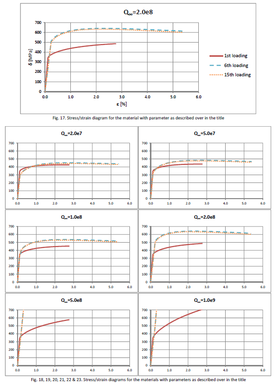 However, I have some problem with 4 and 5. Q_inf is 'maximum increase of elastic range' which clearly should only change the f_y of the material. And do nothing during the first cycle, as there is no back-stress. Point is, it changes the slope of the curve of the first cycle as well. Seems like Q_inf not only changes the f_y but somehow scales up (or down) the position of neighbour points of the yielding point (all the curves in plastic stage presented on page 4 seems to be the same but in a different scale).