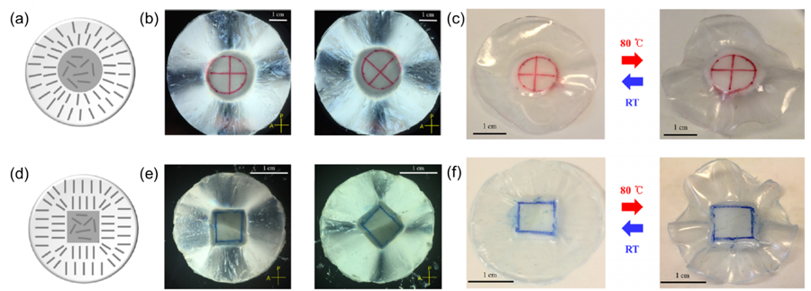 Figure 2. (a) Schematic of LC molecular orientation in the LCE sheet with a circular stiff region in the middle; (b) Polarized optical microscope images of the LCE sheet with two different angles with respect to the analyzer; (c) Reversible thermally driven undulation in patterned LCEs with a circular constraint in the middle; (d) Schematic of LC molecular orientation in the LCE sheet with a square stiff region in the middle; (e) Polarized optical microscope images of the LCE sheet with two different angles with respect to the analyzer; (f) Reversible thermally driven undulation in patterned LCEs with a square constraint in the middle [15].