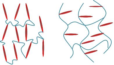 Figure 1. Molecular structure of main-chain liquid crystal elastomer (left) and side-chain liquid crystal elastomer (right). The rod like molecules are mesogens.