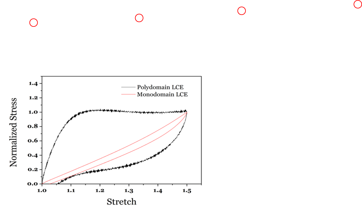 1. You mentioned that the polydomain-to-monodomain transition is a possible toughening mechanism for LCE. Is there any bulk mechanical testing data (e.g. uniaxial tension) showing hysteresis and dissipation solely caused by this transition? I would guess this may be not straightforward in experiments since viscoelasticity is also present, as you pointed out, and can also lead to hysteresis. I ask this question because even in elastic networks, stretch can also cause alignment of chains as shown in a few Molecular Dynamics simlations (e.g. Bergstrom & Boyce 2001, Yang et al. 2015), but such chain alignment does not cause any energy dissipation.