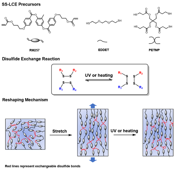In our group, we incorporated disulfide bonds which can be exchangeable either under high temperature or UV light irradiation into LCE [25]. All the chemicals used in the synthesis are also commercially available. The disulfide LCE can be fabricated from polydomain to monodomain upon either heating or UV light. What is more, there is no catalyst or photoinitiator needed in disulfide exchange reaction. So the disulfide LCE can keep its reprocessibility even being stored for 3 months which is reported for the first time.