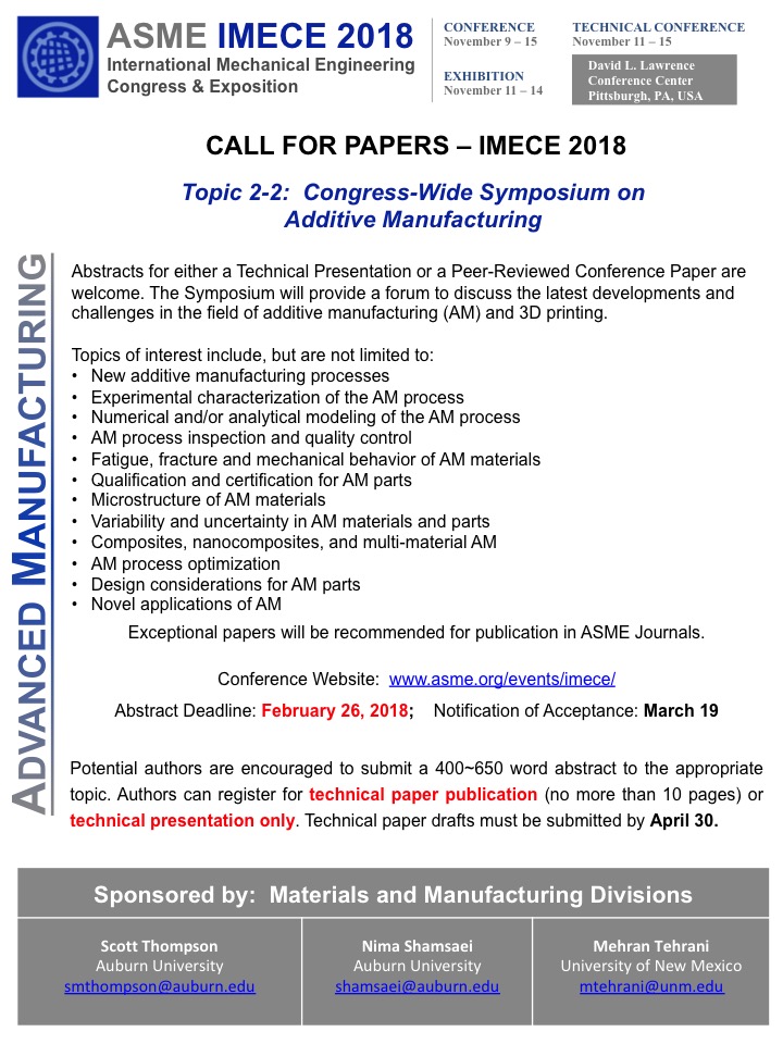 Congress-Wide Symposium on Additive Manufacturing (Topic 2-2), IMECE-ASME, Pittsburgh, PA, November 9-15th of 2018. The abstracts (400-650 words) are due Feb 26th.