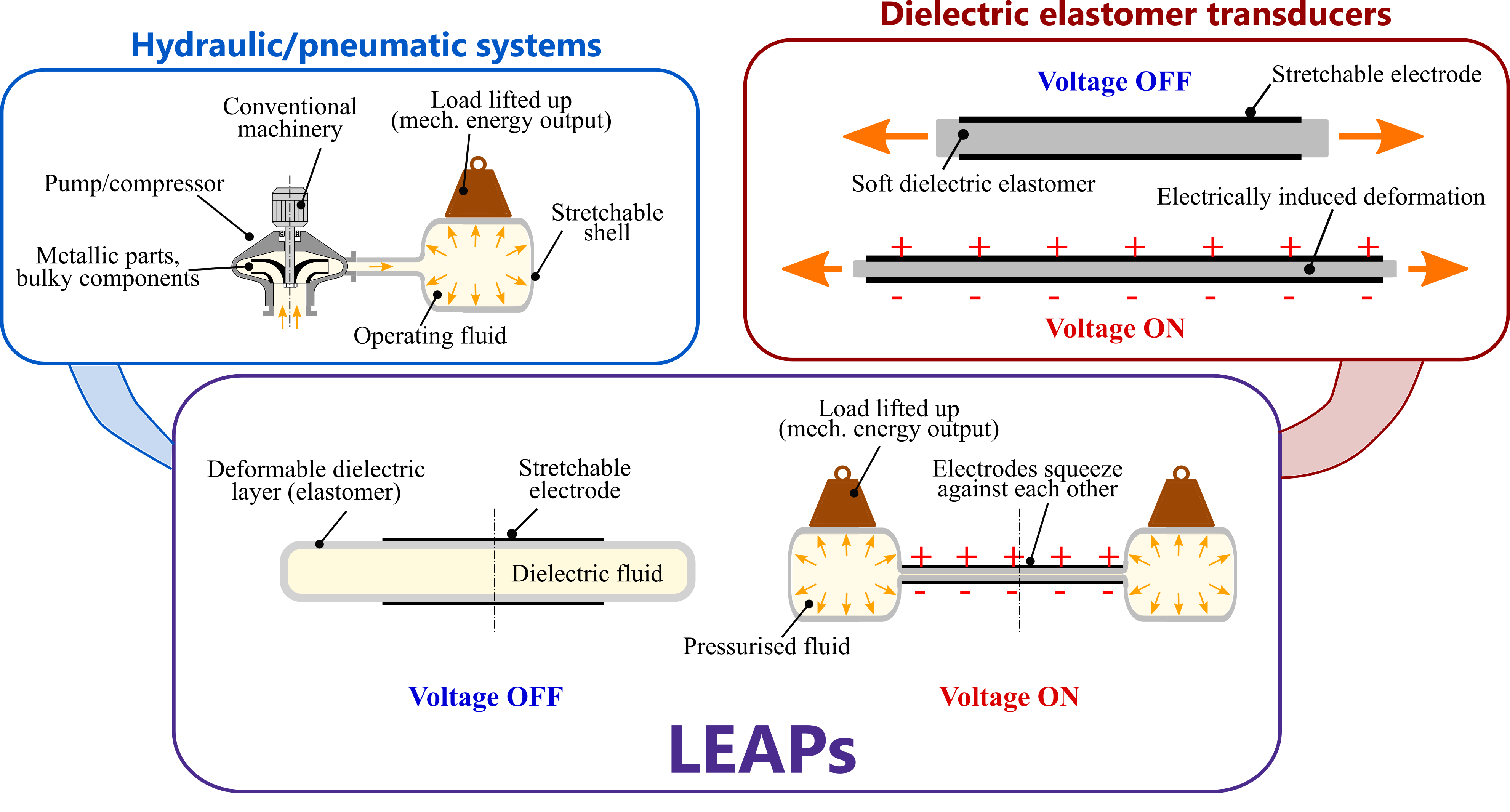 LEAP transducers (actuators and generators) are a highly promising technology that combines the features of hydraulic drives and the advantages (in terms of light weight, low cost, resilienace and compliance of EAPs). This PhD scholarship is meant at gaining understainding of LEAPs physics and designing/prototyping a number of devices for robotics and energy harvesting applications.