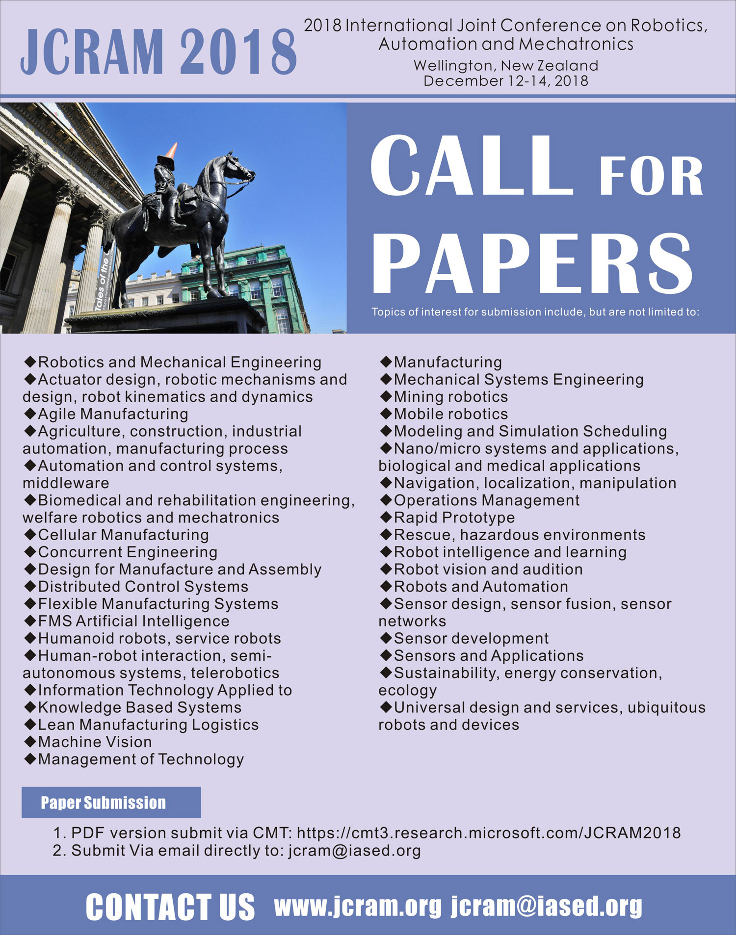 On December 12-14, 2018 International Joint Conference on Robotics, Automation and Mechatronics (JCRAM 2018 www.jcram.org) will be held in Wellington, New Zealand. The conference is organized by IASED (International Academy of Science and Engineering for Development, www.iased.org) and technical supported by many university and institute.