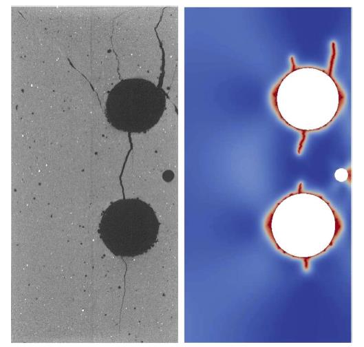 · Comparisons between experimental cracks and phase field simulations in drilled plaster samples loaded in compression.