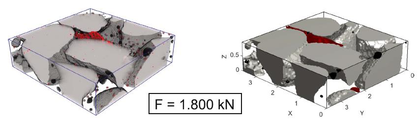 Fig. 6: Compression test on a microtomography image-based model of EPS lightweight concrete taking into account interfacial damage.