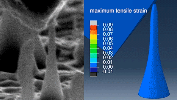 Figure 1. Experiment and simulation of a diamond nanoneedle being bent by the side surface of a nanoindenter tip, showing ultralarge and reversible elastic deformation. [53]
