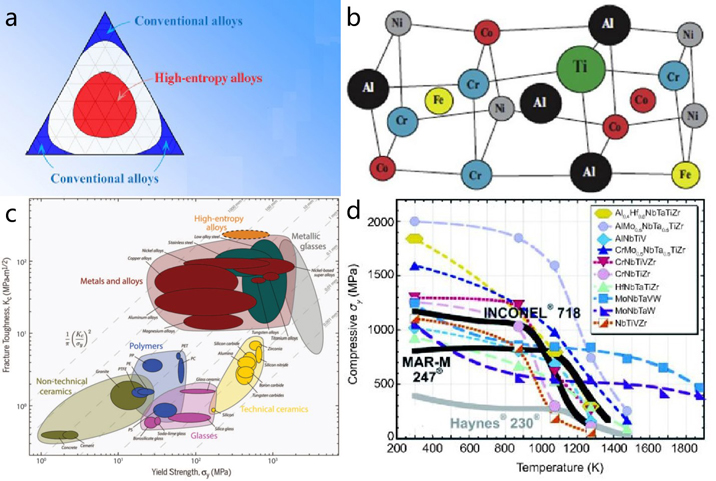 Fig 1. (a) Schematic illustration of a typical ternary phase diagram. It shows the difference between conventional alloys and HEAs [10]. (b) Schematic illustration of severe lattice distortion. It is caused by randomly distributed atoms with different sizes occupying the lattice site in HEAs [11]. (c) Ashby map showing fracture toughness as a function of yield strength for HEAs in relation to a wide range of material systems [12]. (d) Temperature dependence of compressive yield strength in some BCC HEAs. For comparison, some conventional high temperature superalloys also are included. It shows that BCC HEAs have more stable high temperature properties [4].