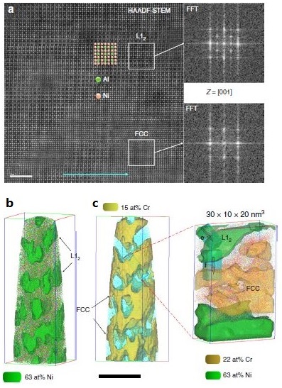 Fig 2. (a) High-resolution STEM image revealing the nanostructure in the grains consisting of disordered FCC matrix and ordered L12 phases with diffuse coherent interfaces. (b-c) APT data showing 3D morphologies of the ordered L12 nanoprecipitates and disordered FCC matrix.