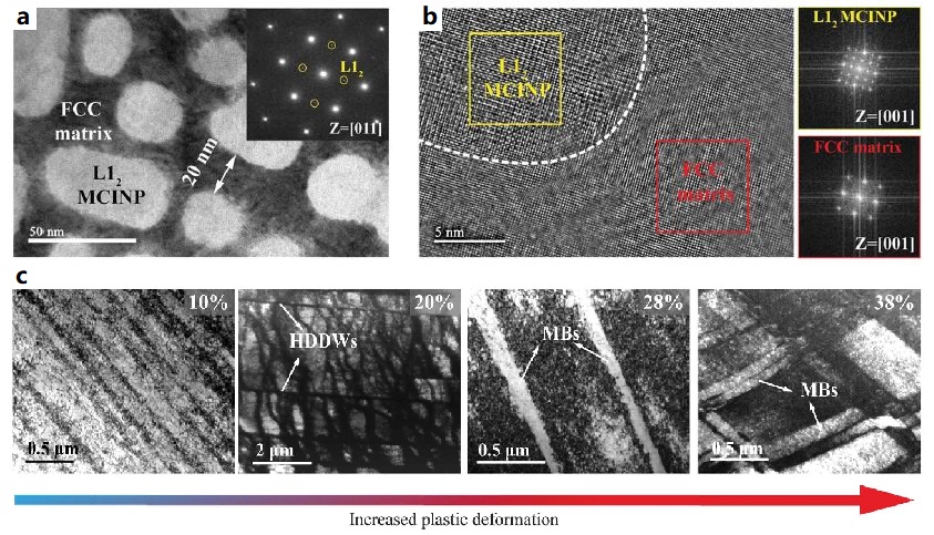 Fig 3. (a) TEM image showing the nanostructured L12 phases inside the FCC matrix. (b) High-resolution TEM image showing the coherent interfaces between the L12 phases and matrix. (c) Dynamic evolution of the deformation substructures of HEA with increasing tensile strain. It reveals the influence of L12 phases on dislocation slips and main plasticity mechanisms (HDDWs: high density dislocation walls; MBs: micro-bands). [29]