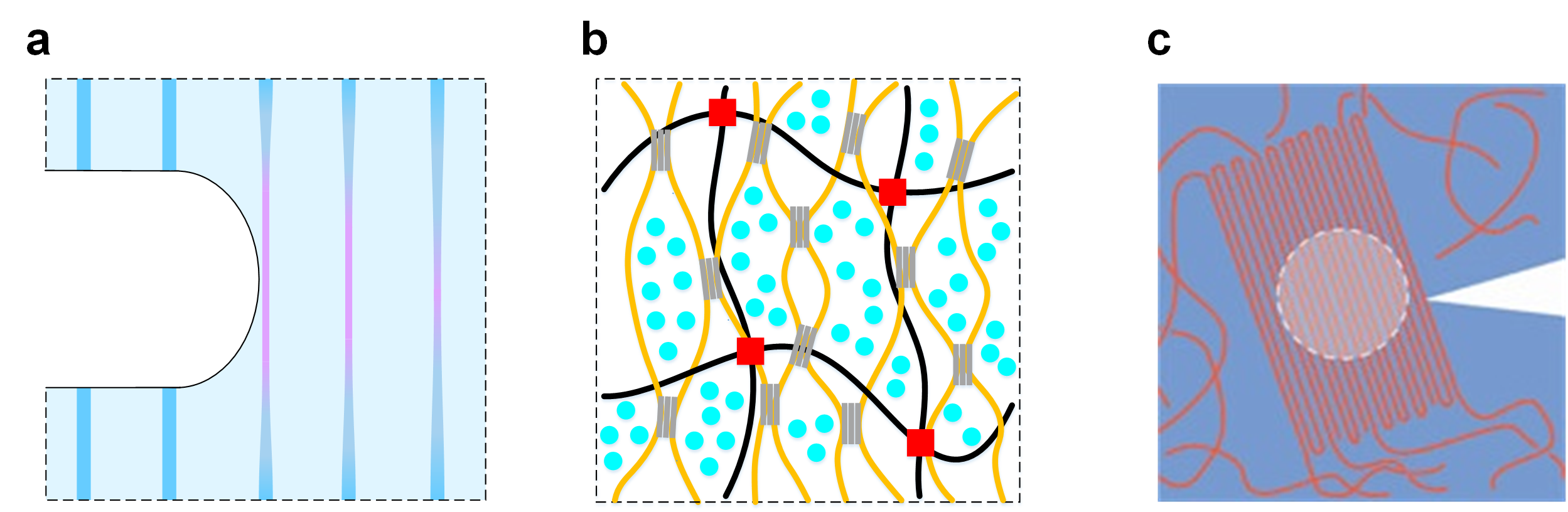 Fig. 10. Strategy for hydrogels of high endurance. (a) A composite with a matrix of compliant network and fibers of a stiff network, both elastic, having high modulus contrast and strongly adhering [24]. (b) Bundles of polymer chains are aligned at the molecular level to deflect a crack [25]. (c) Crystalline domains replace the single layer of polymer chains to dissipate more energy at the crack front [26].