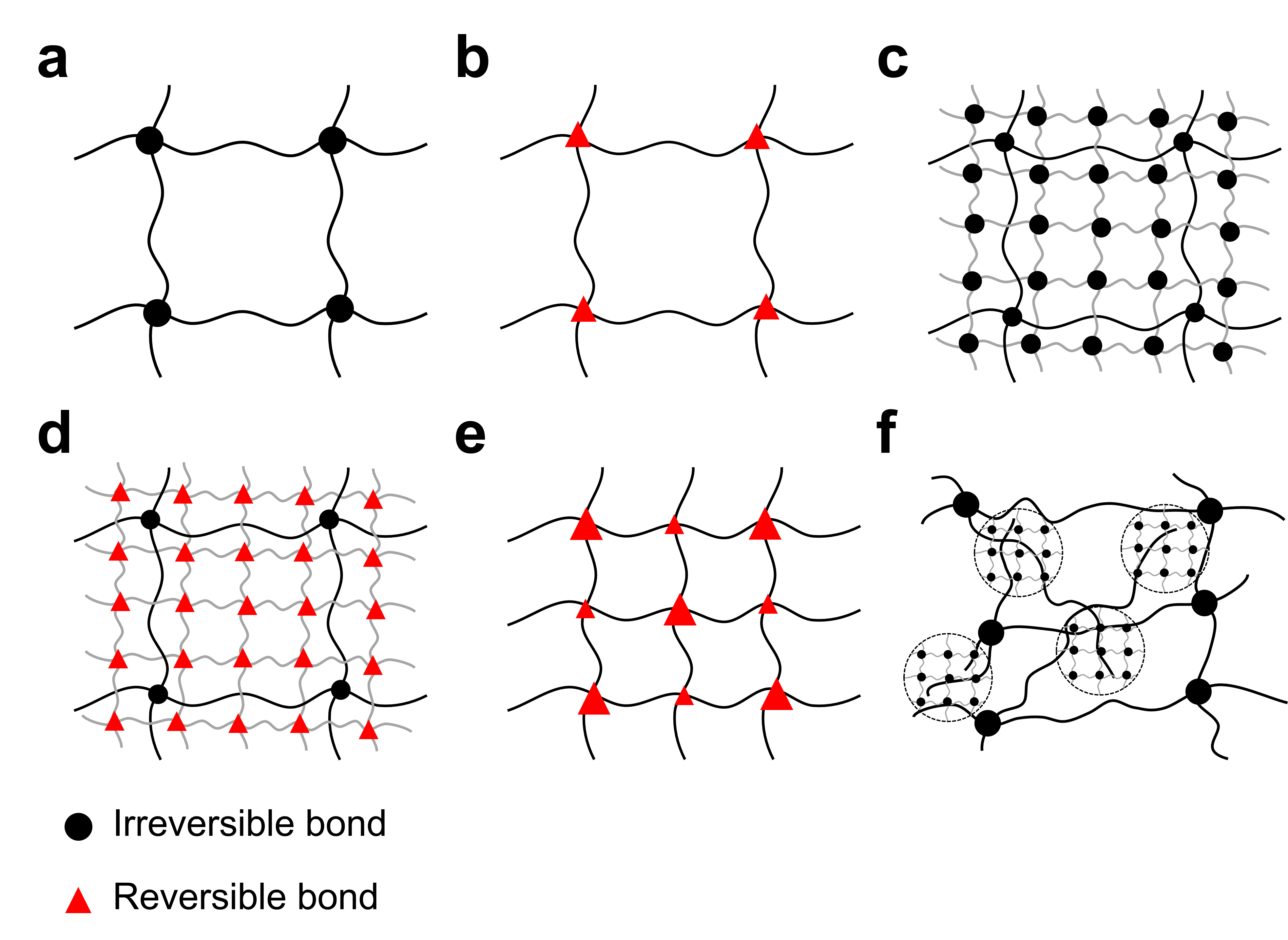 Irreversible bonds can be relatively strong, but do not reform after breaking despite extreme conditions (e.g., C-C bonds). Reversible bonds are typically weak, and may reform after breaking (e.g., some ionic bonds). By a topology of connection we mean an arrangement of bonds of various types to link monomer units into polymer chains, and crosslink the polymer chains into polymer networks. The difference in the topologies of connection causes difference in the symptoms of fatigue.Under a monotonic load, a double-network hydrogel resists the growth of a crack by dissipating energy through two mechanisms: scission of primary polymer networks on the plane of the crack, and breaking of sacrificial bonds in the bulk of the hydrogel. The sacrificial bonds act as a toughener. Representative topologies of connection are presented in Fig. 2.