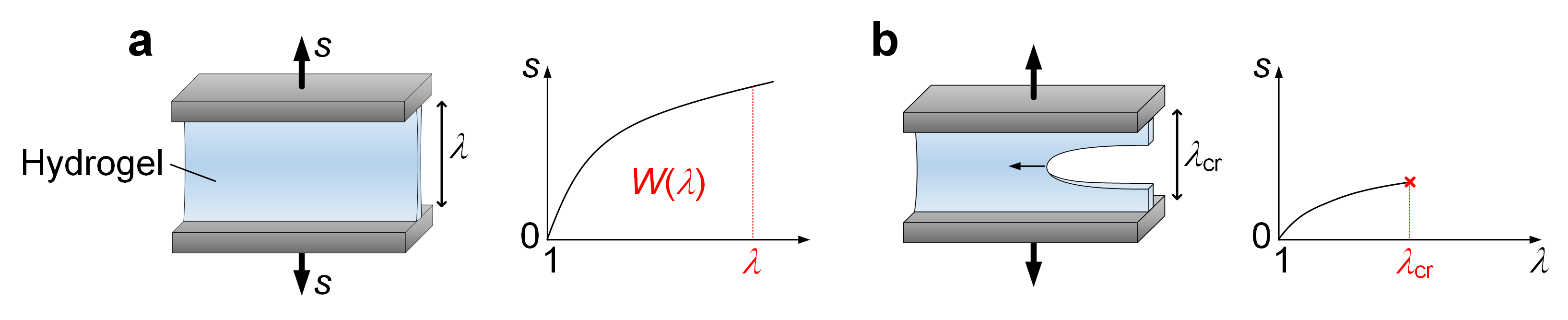 In a pure shear test (Fig. 3), the energy release rate in a precut sample is G = HW(lambda), where H is the height of the sample in the undeformed state. For an elastic hydrogel, W(lambda) is the elastic energy density of the uncut sample.