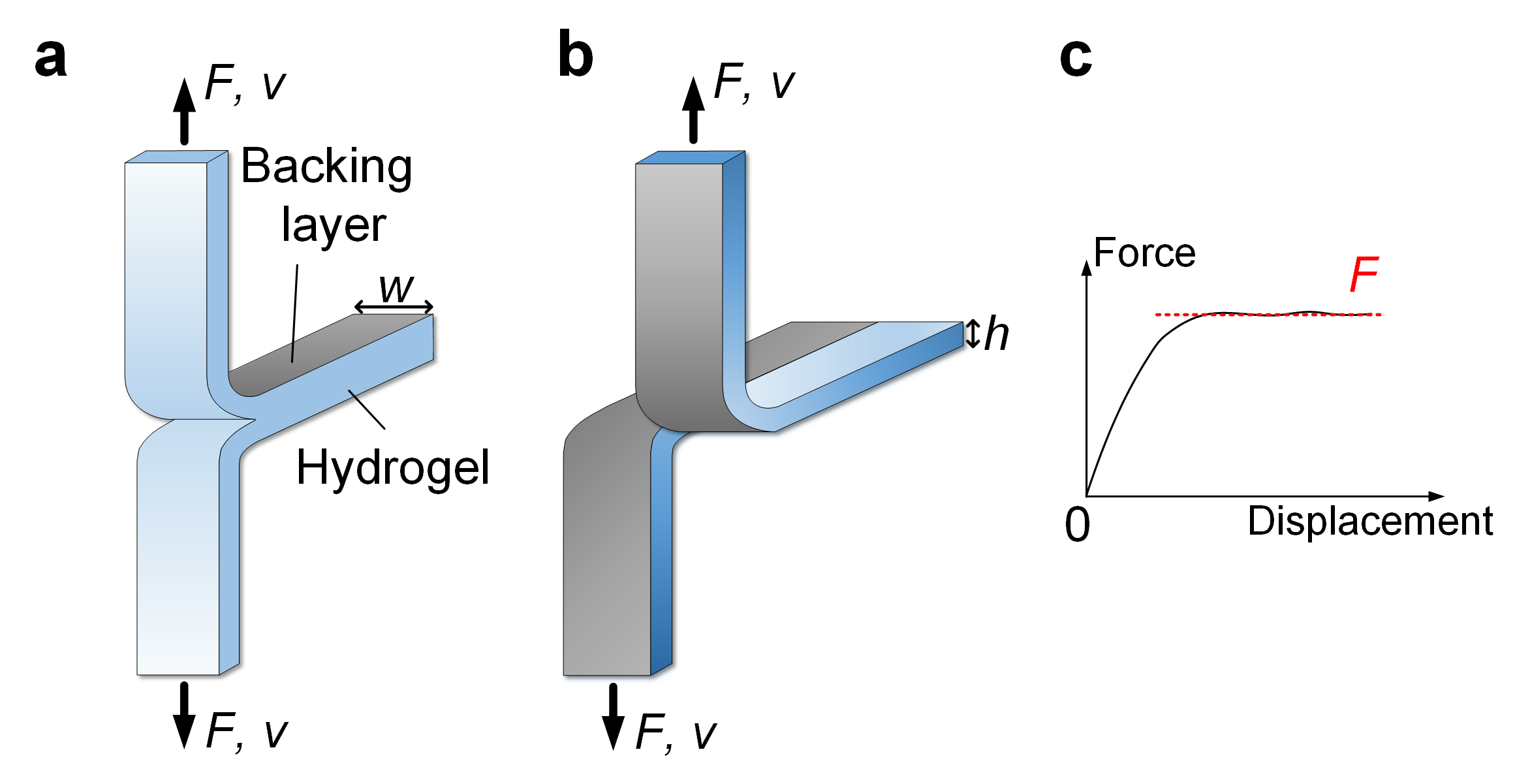 In peel (Fig. 4a) or tear (Fig. 4b), the sample is often attached with two inextensible backing layers, which suppress the deformation far away from the crack front. Upon loading, the crack may grow into a steady state, and the force may reach a plateau (Fig. 4c). In the steady state, the energy release rate is G = 2F/w for peel, and G = 2F/h for tear, where w is the width and h is the thickness of the sample.
