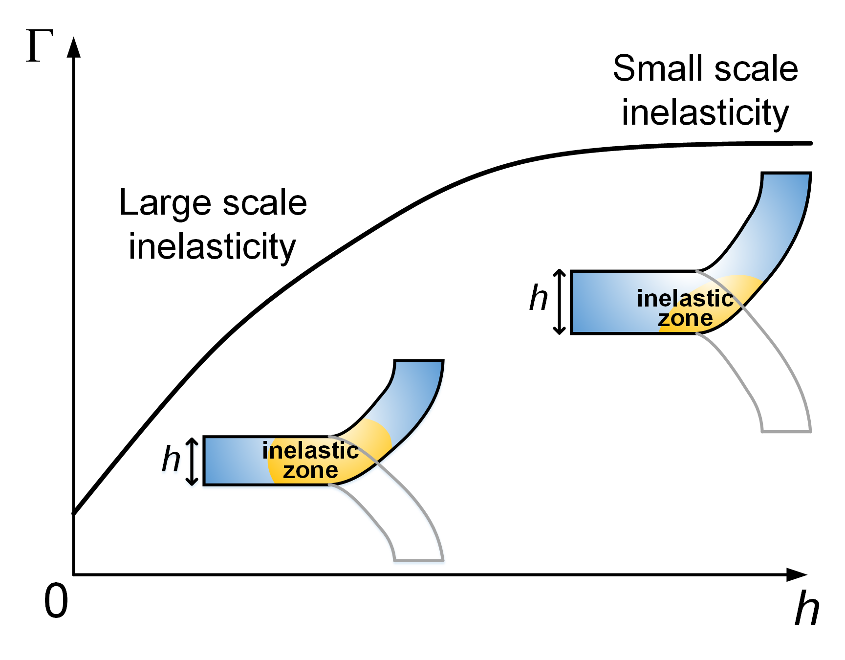 Because the thickness of the sample can be readily adjusted over a large range in peel and tear, peel and tear can be used to probe the scale of inelasticity [11]. The measured toughness is a function of the thickness of the sample (Fig. 5), determined by small-scale or large-scale inelasticity (Fig. 5).