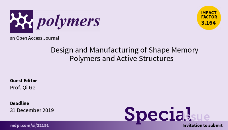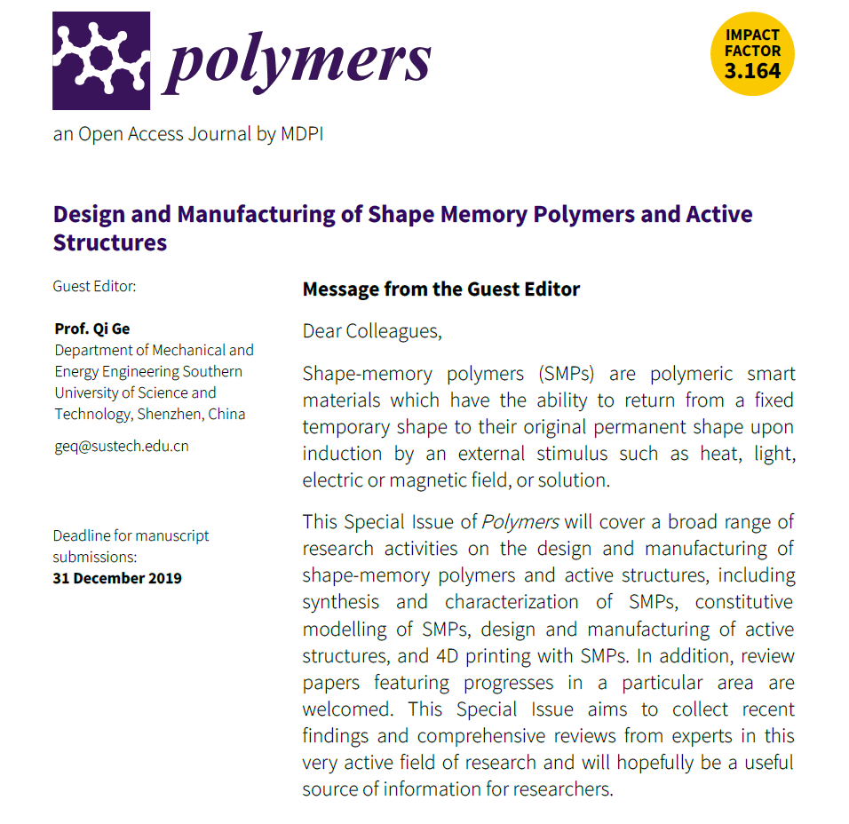 The special issue “Design and Manufacturing of Shape Memory Polymers and Active Structures” of Polymers is now inviting submission. If you have any suitable manuscript, please consider this special issue. Feel free to contact me through geq [at] sustech.edu (geq[at]sustech[dot]edu), if you have any questions. Thank you all for your support!