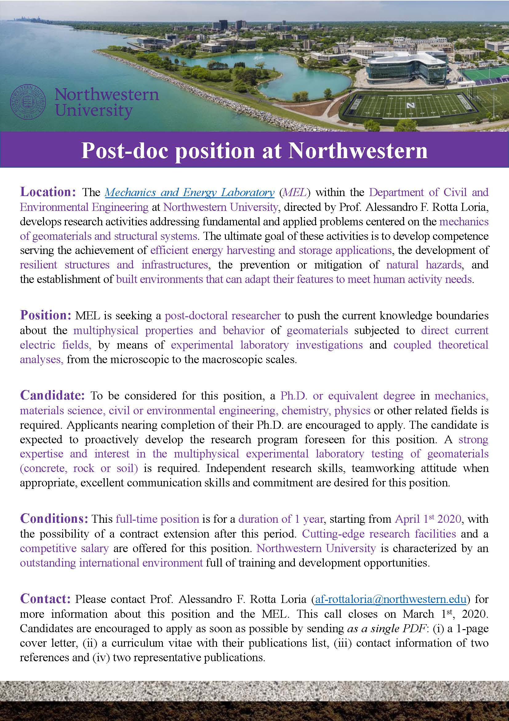The Mechanics and Energy Laboratory within the Civil and Environmental Engineering Department at Northwestern University, directed by Prof. Alessandro F. Rotta Loria, is looking to hire a post-doctoral researcher. The selected post-doctoral researcher will develop a project on the multiphysical behavior of geomaterials subjected to direct current electric fields through experimental investigations and theoretical analyses. This full-time position is for a duration of 1 year, starting on April 1st 2020, with the possibility of a contract extension.